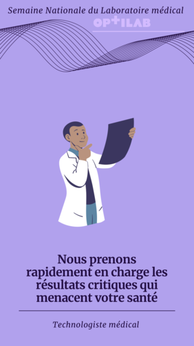 Il est tout aussi important de promouvoir la profession de technologiste médical et de reconnaître la contribution inestimable du personnel administratif, des assistants techniciens, des techniciens classe B, des biochimistes cliniques, des médecins biochimistes, des hématologues, des microbiologistes et des pathologistes. Puisque le travail effectué au labo passe souvent inaperçu, rappelons que 85 % des diagnostics reposent sur les résultats des analyses effectuées au laboratoire médical. Il s’agit d’un travail essentiel pour assurer les soins aux patients.