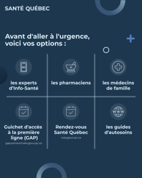Si votre état de santé ou celui d’un proche nécessite des soins rapidement, rendez-vous à l’urgence la plus proche. Pour une assistance immédiate, composez le 911.